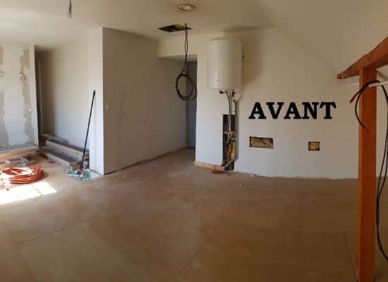 Pour commencer, notre équipe a réalisé une séparation en placo pour distinguer la chambre de la salle de bain, puis une deuxième séparation placo a été réalisé pour la séparation de la douche. Pour les besoins de cette nouvelle pièce, notre plombier a installé un chauffe-eau.