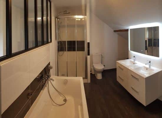 Notre client a fait le double choix de s’équiper d’une douche, comprenant un receveur 100x80cm avec une colonne de douche ainsi qu’une paroi 3 volets coulissants, et d’une baignoire avec mitigeur thermostatique et douchette. Notre équipe a mise en place un meuble double vasque 120cm avec miroir à éclairage LED. Nous avons également équipé cette salle de bain d’un pack WC avec SANIBROYEUR. Le carreleur a réalisé la pose du carrelage et de la faïence pour l’ensemble de la salle de bain. Notre électricien s’est occupé de tous les branchements électriques de ce projet.
